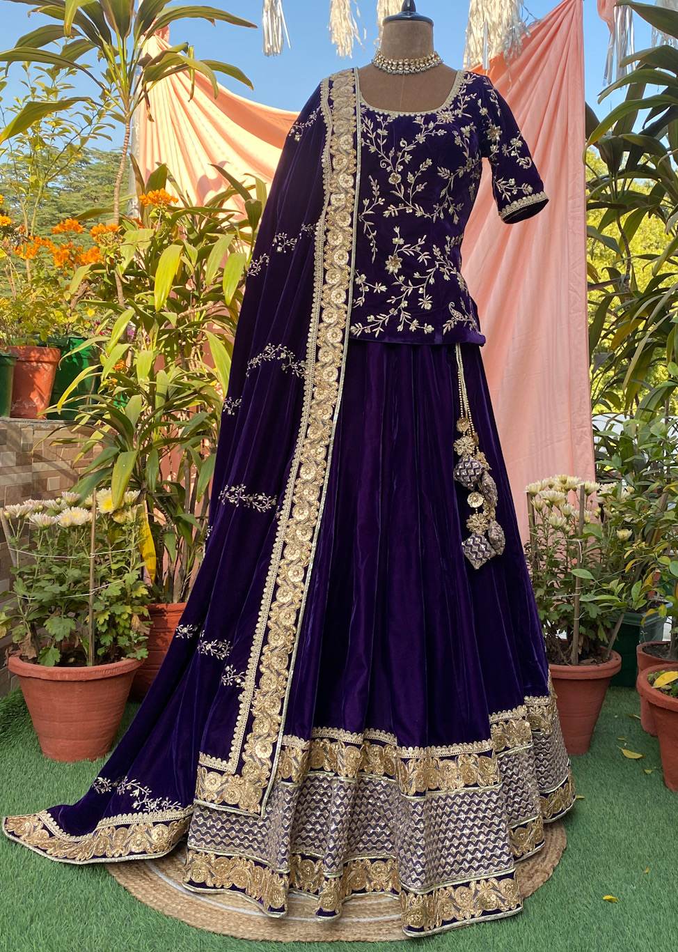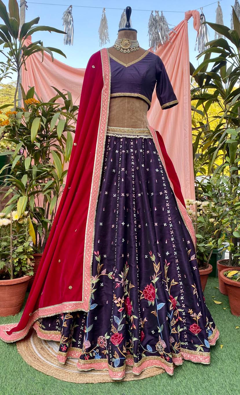 Dark purple velvet lengha