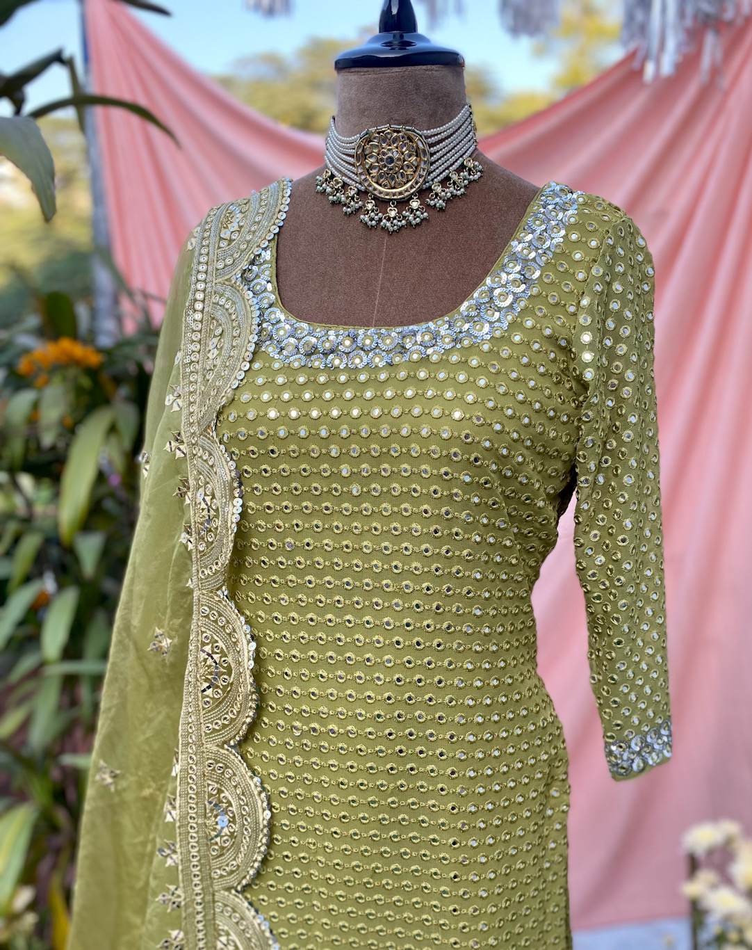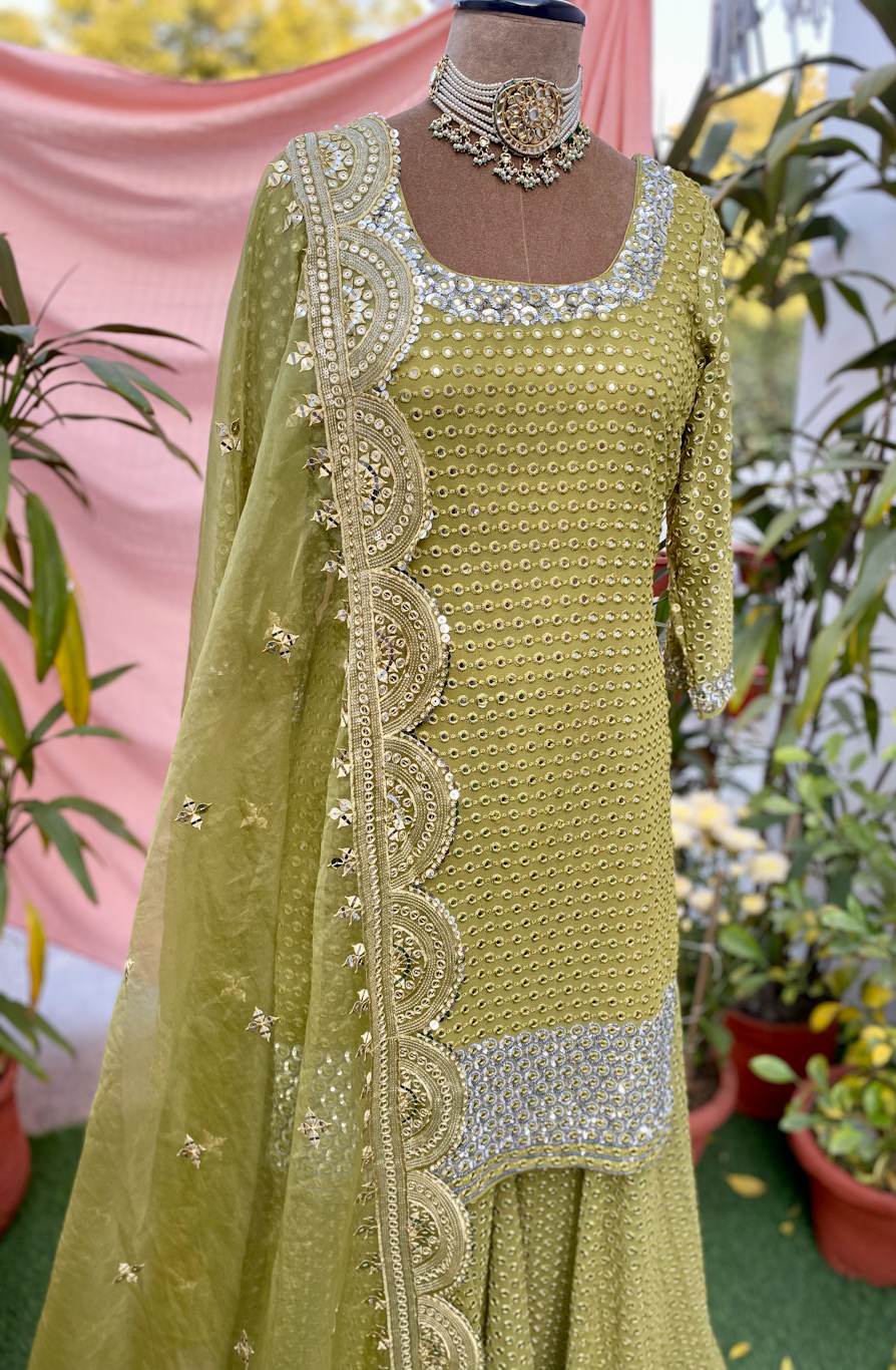 Olive green mirror embroidered sharara