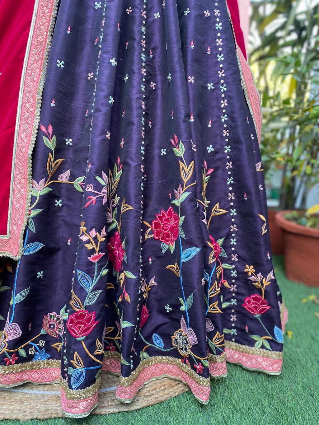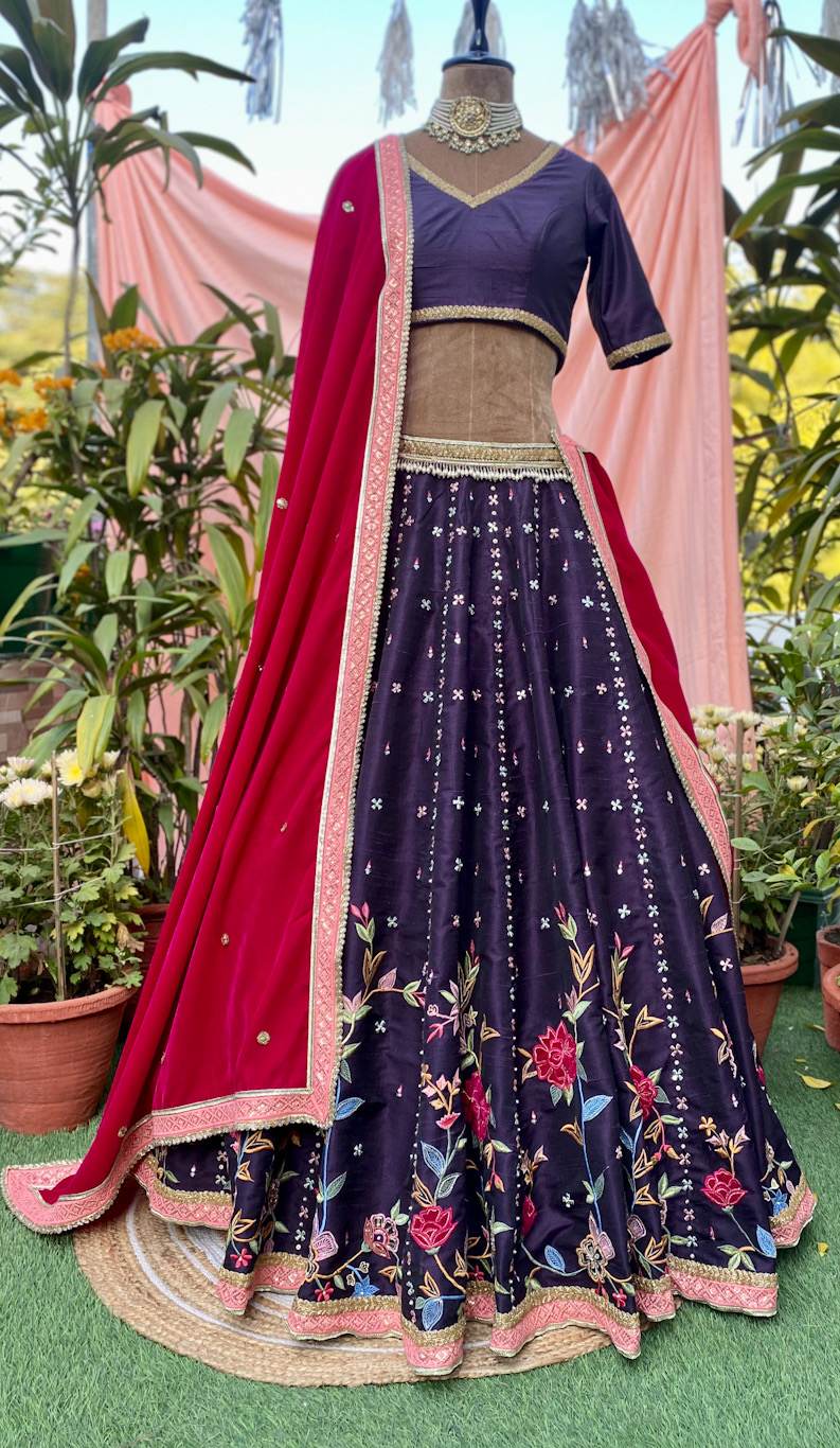 Purple raw silk floral embroidered lehenga