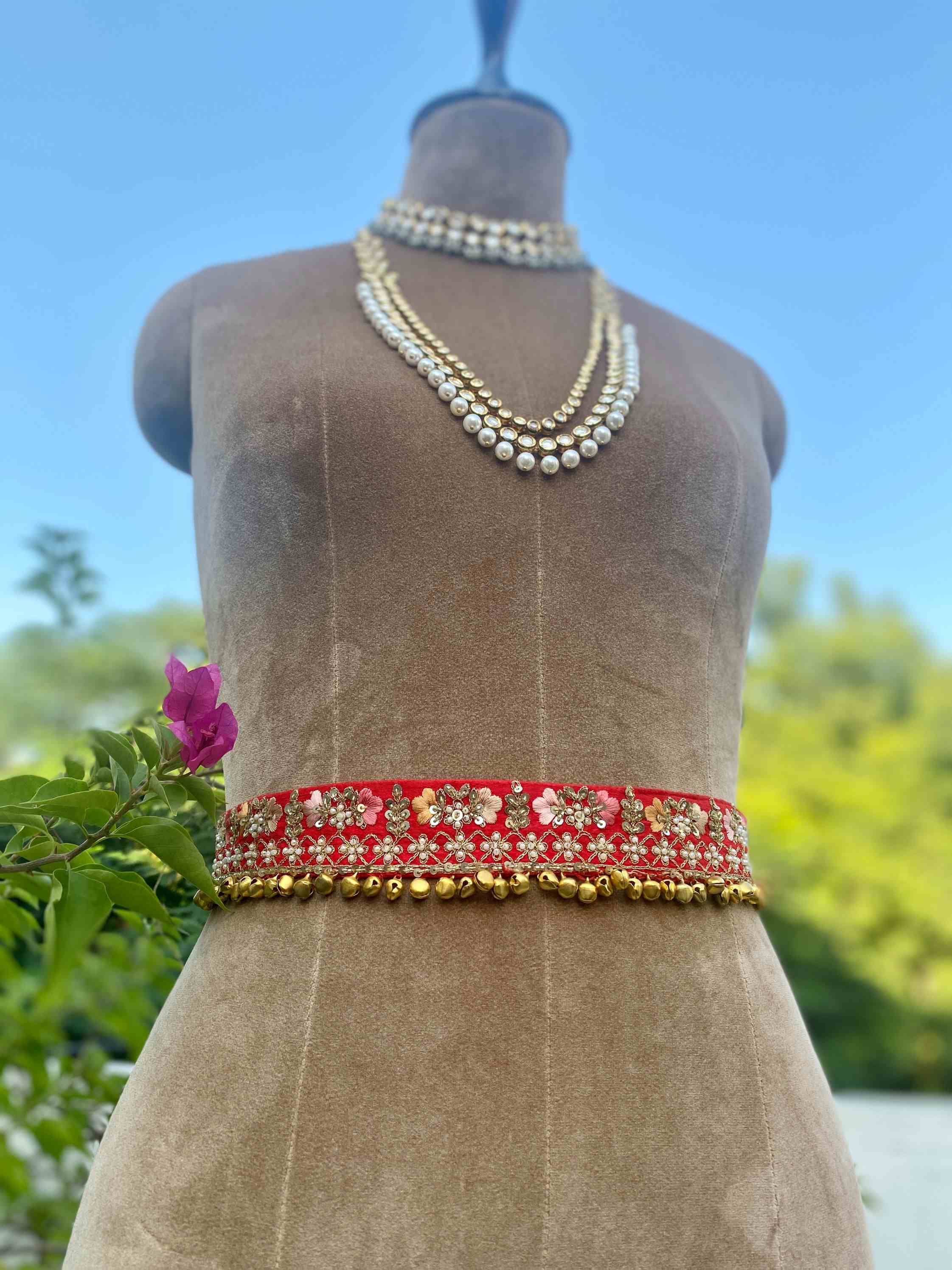 Red Silk Floral Resham Waist Belt with Ghungroo