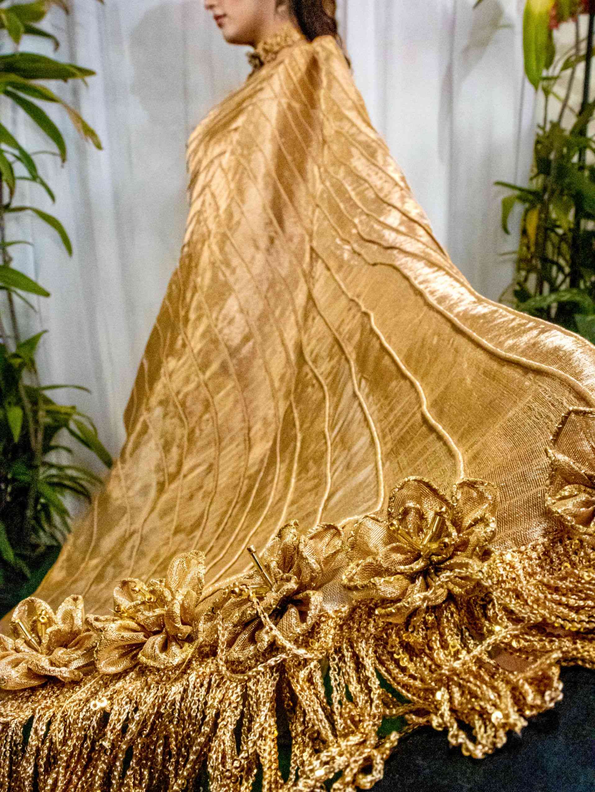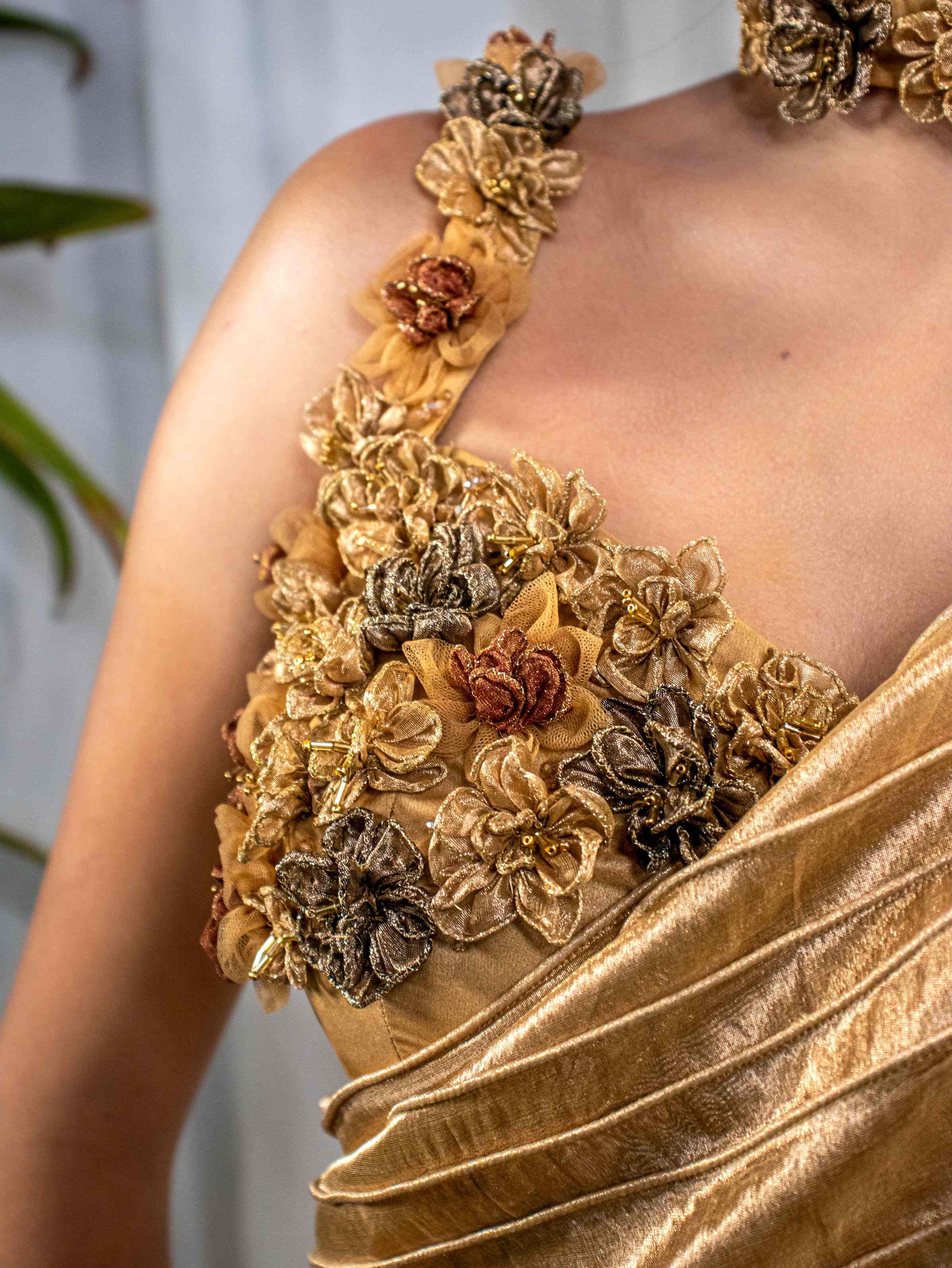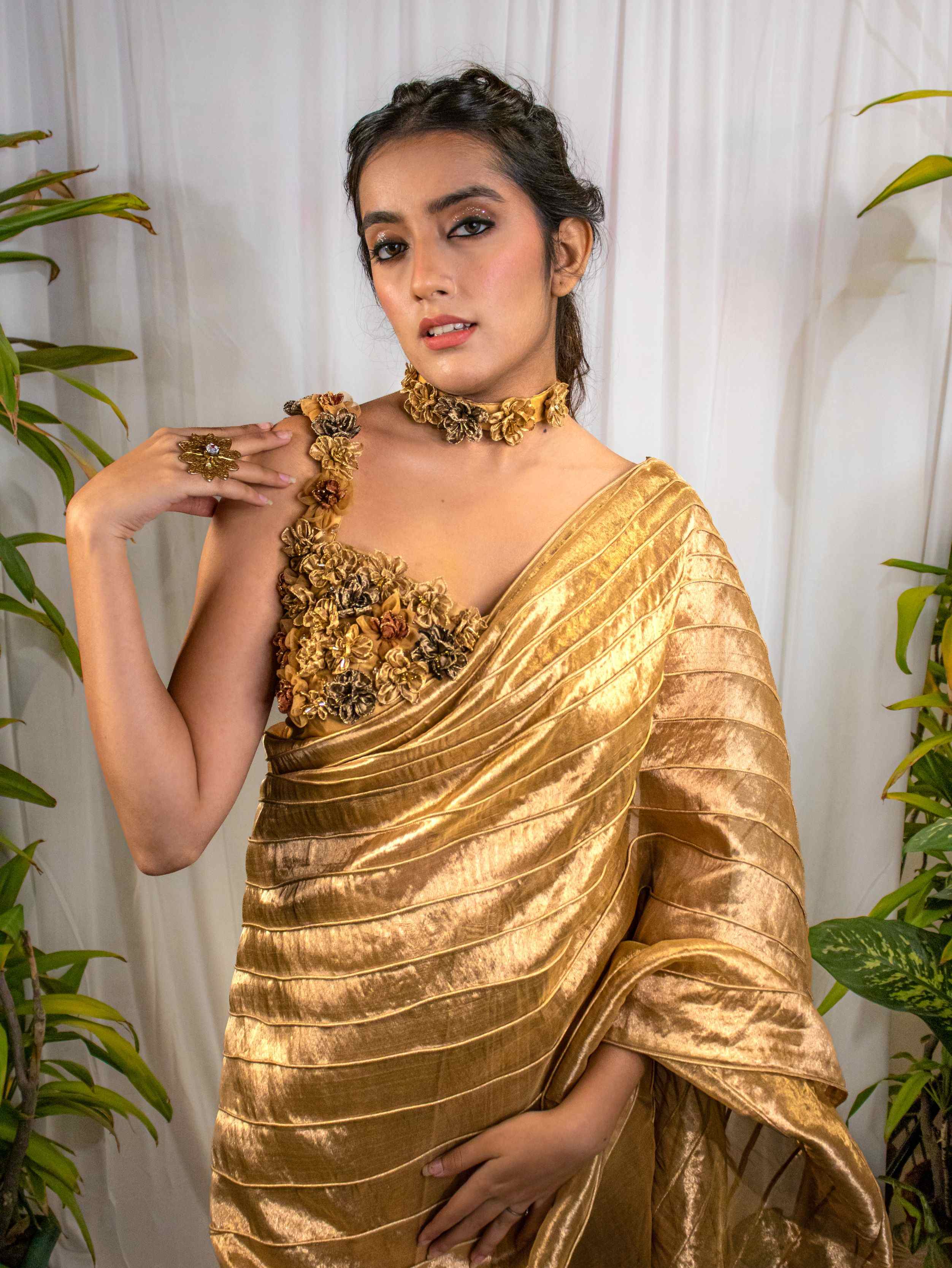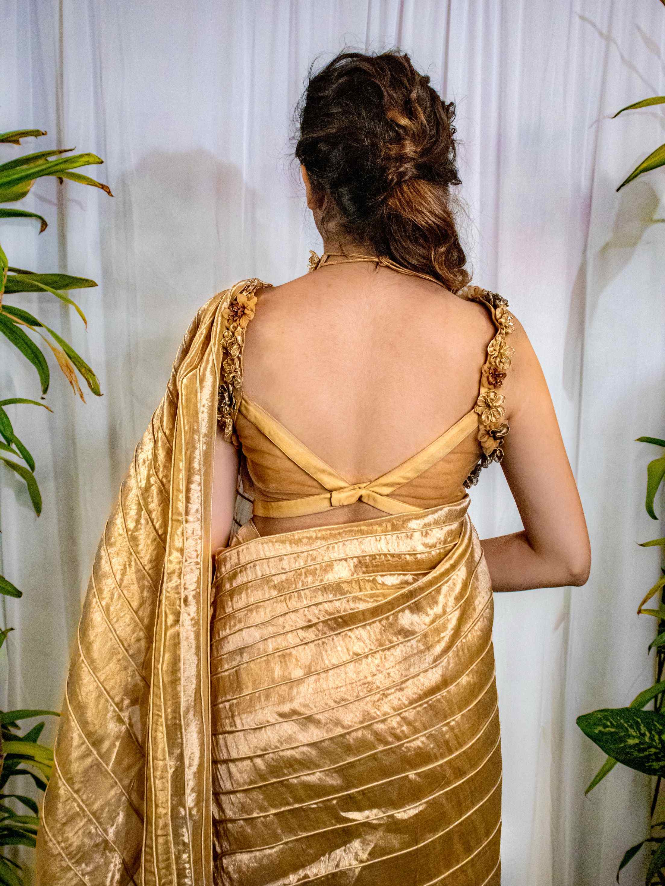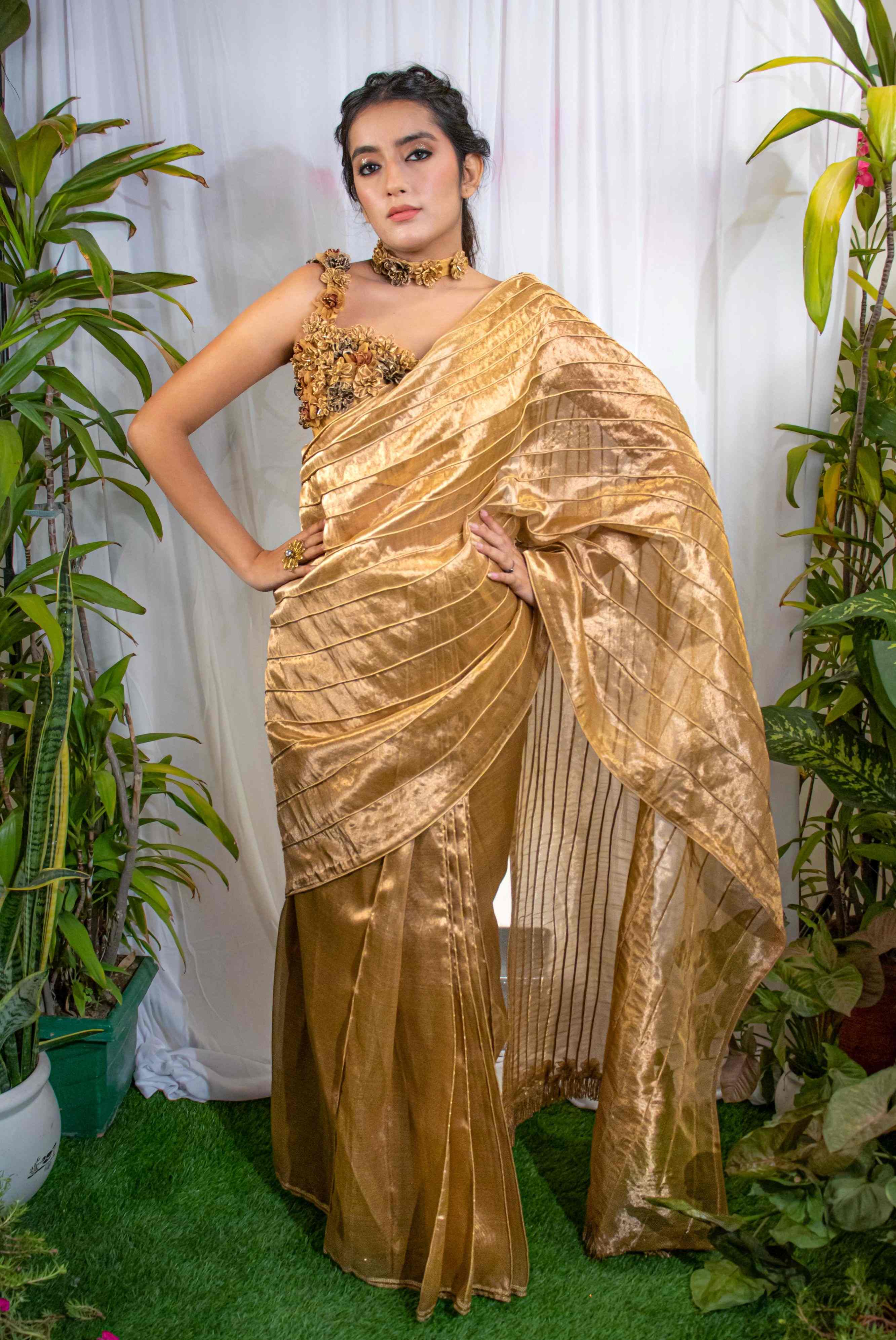 Gold Tissue Saree with Floral Handcrafted Blouse.